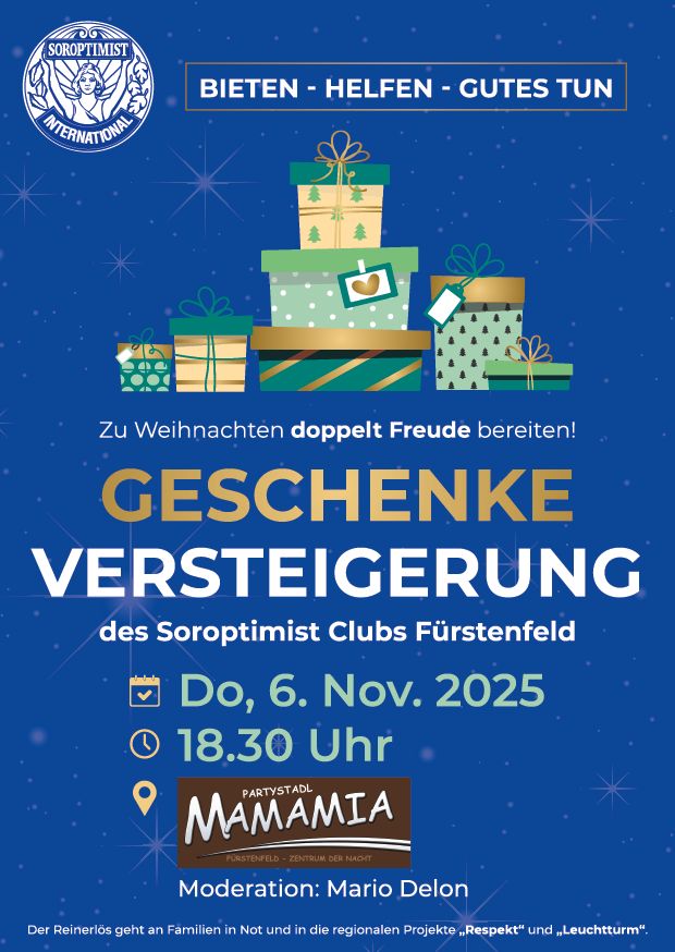 Mamamia Fürstenfeld Stadt-Zug-Platz 3, Fürstenfeld, Austria🎁 GESCHENKE VERSTEIGERUNG – Bieten, Helfen, Gutes tun! 🎁 📅 Donnerstag, 6. November 2025 🕡 Beginn: 18:30 Uhr 📍 MAMAMIA, Fürstenfeld 🎤 Moderation: Mario Delon Zu Weihnachten doppelt Freude bereiten! Bei der beliebten Geschenkeversteigerung des Soroptimist Clubs Fürstenfeld könnt ihr nicht nur tolle Geschenke ersteigern, sondern gleichzeitig Familien in Not und wichtige regionale Projekte wie „Respekt“ und „Leuchtturm“ unterstützen.… Weiterlesen »Geschenke Versteigerung
